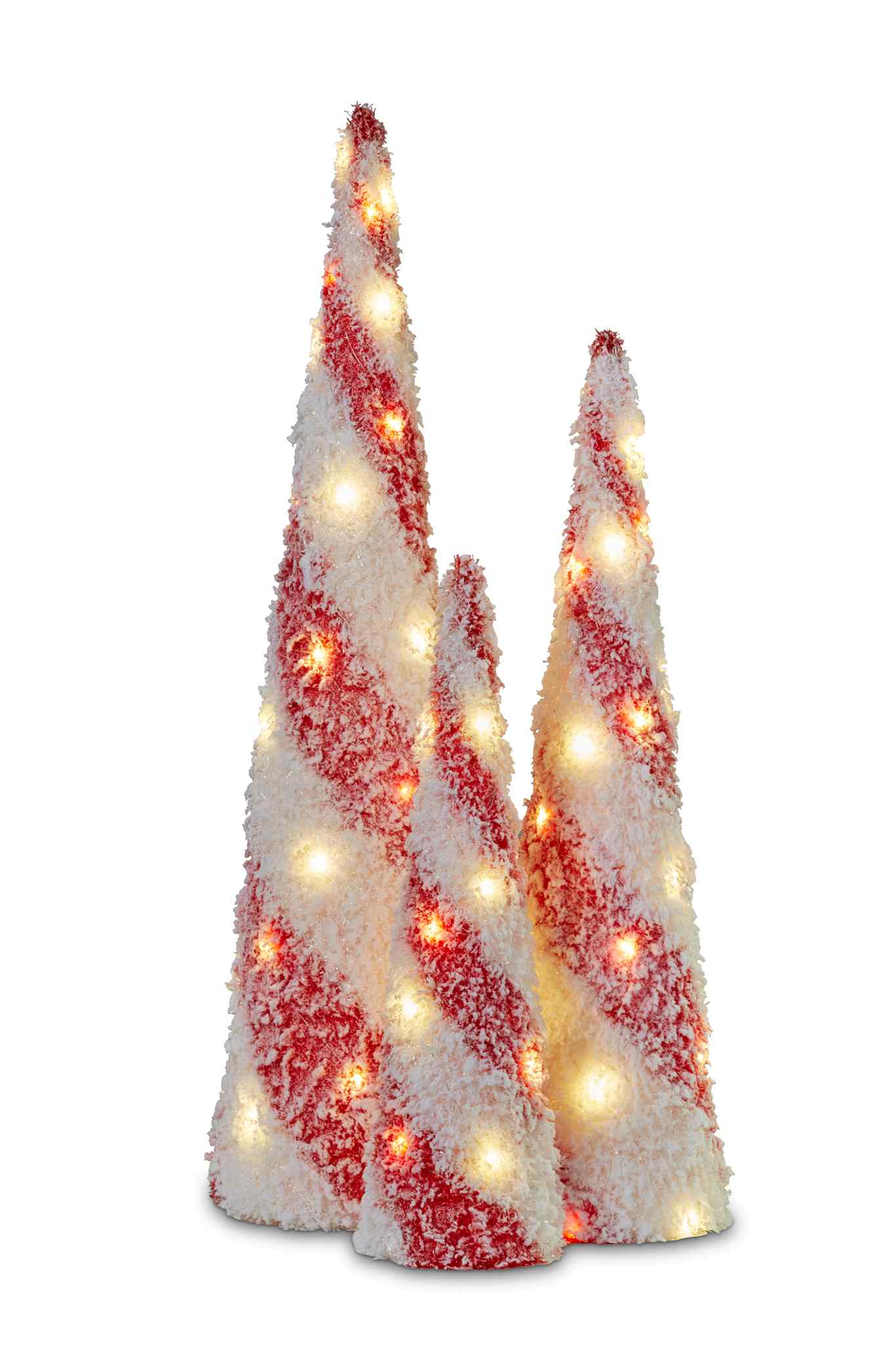 This set of 3 snowy trees with their red and white swirls make a great table display. And they have gorgeous LED lights. 60, 80 & 100cmHigh, 15,25 & 35 copper wire LED lights respectively, 2xAA, 3xAA & 3AA Batteries respectively not included. Wire, tinsel, sisal, plastic, cotton