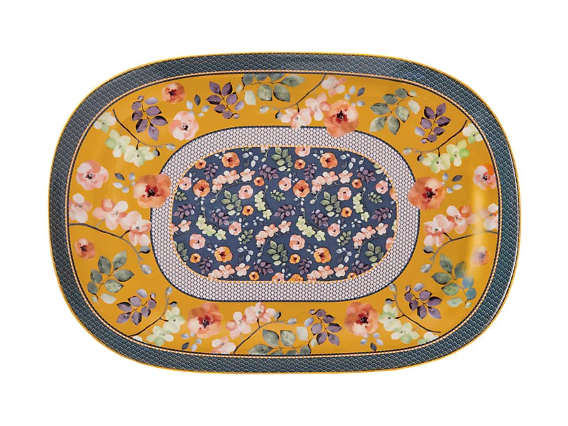 The Arcadia oblong platter will add some vintage flair to your next dinner party. This statement platter features a stylish combination of floral designs and geometric patterns, with a warm palette of pinks, greens and yellows. Made from quality stoneware, it brings a touch of bold personality to canapes, finger food and shared dishes. Use it for casual entertaining or coordinate it with the rest of the Arcadia collection for an eclectic dinner party spread. A wonderful gift idea.