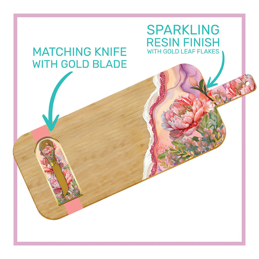 Bamboo Serving Platter with resin overlay and gold flakes. Includes matching cheese knife with gold blades and printed backing card with gold detail. Designed by Australian Artist Lisa Pollock, these boards are not only practical but beautiful too. Add a stunning statement piece to your next party table.