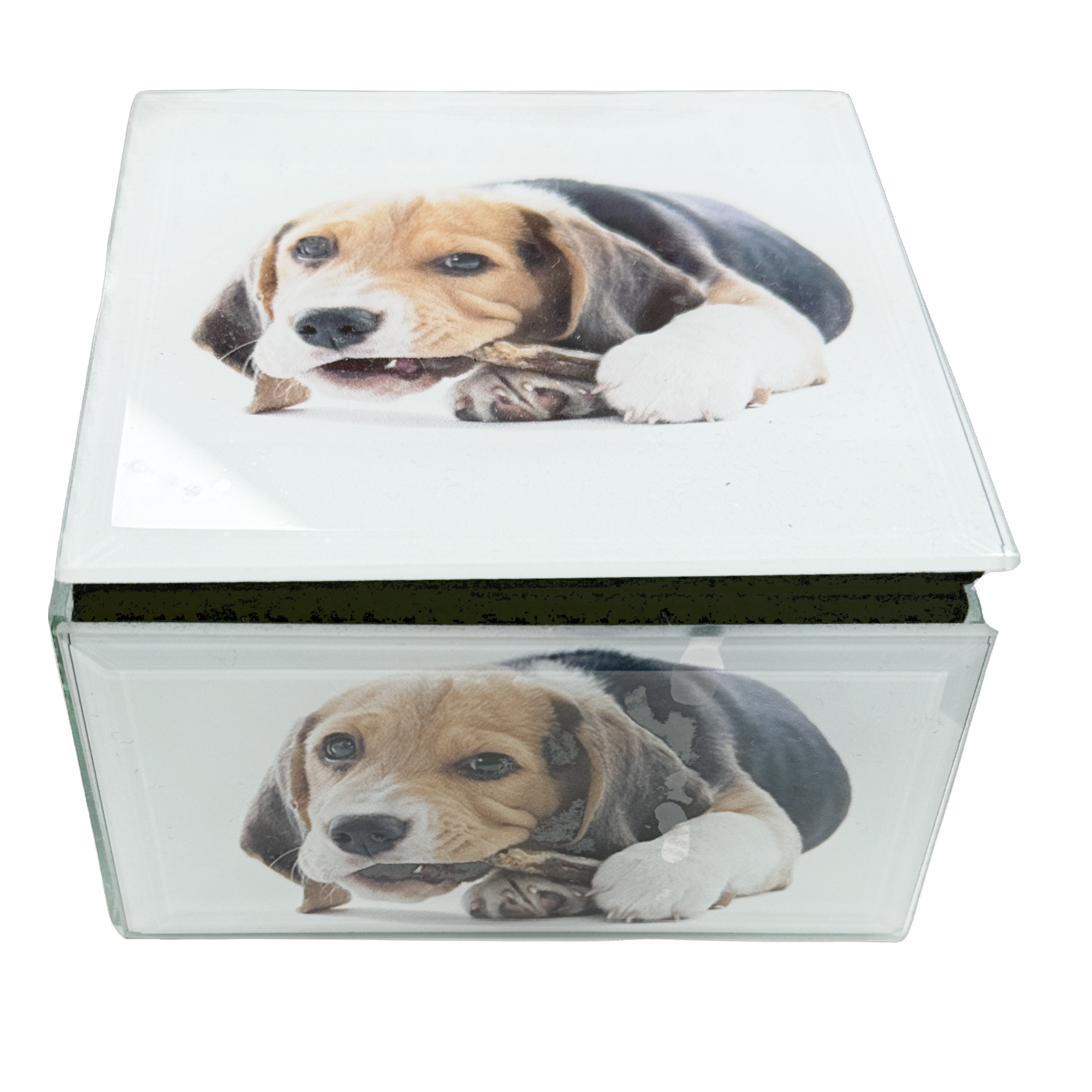 Preserve your precious memories in style with our exquisite Puppy Keepsake Box. Crafted from high-quality glass and adorned with a charming beagle puppy design, this 100mm x 100mm x 65mm box is the perfect way to safeguard your cherished mementos.