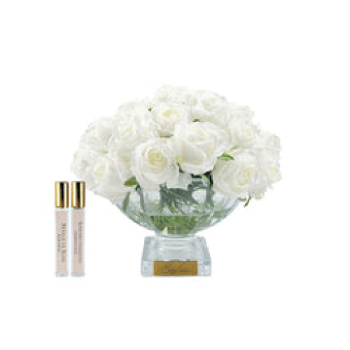 Centrepiece Square Base Vase – White Rose Buds with Gold Badge