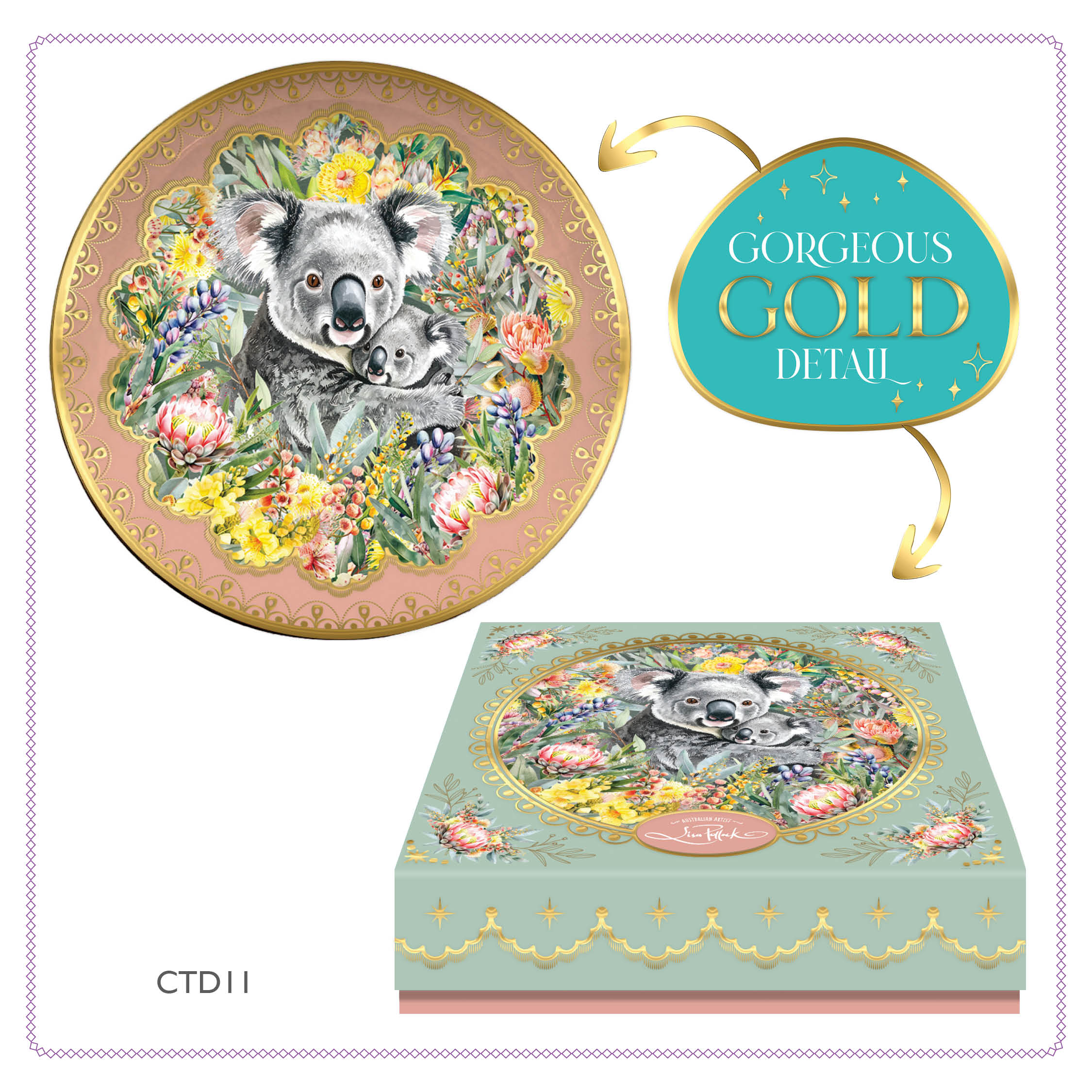 Ceramic Trinket Dish. Gold Edging. 10.5cm round. Inc gift box. Koala Cuddles