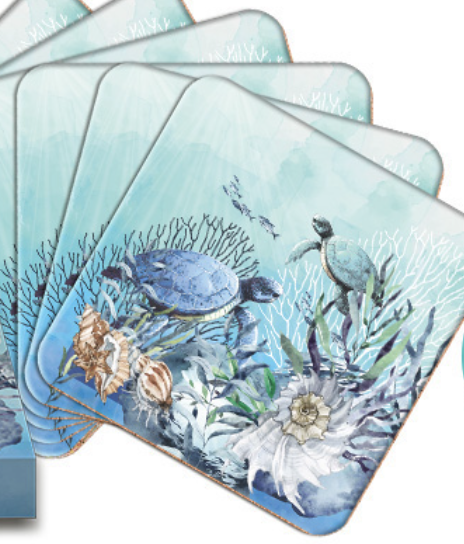 Set of 6 Coasters in gift box. Set Turtle design. MDF & cork.
