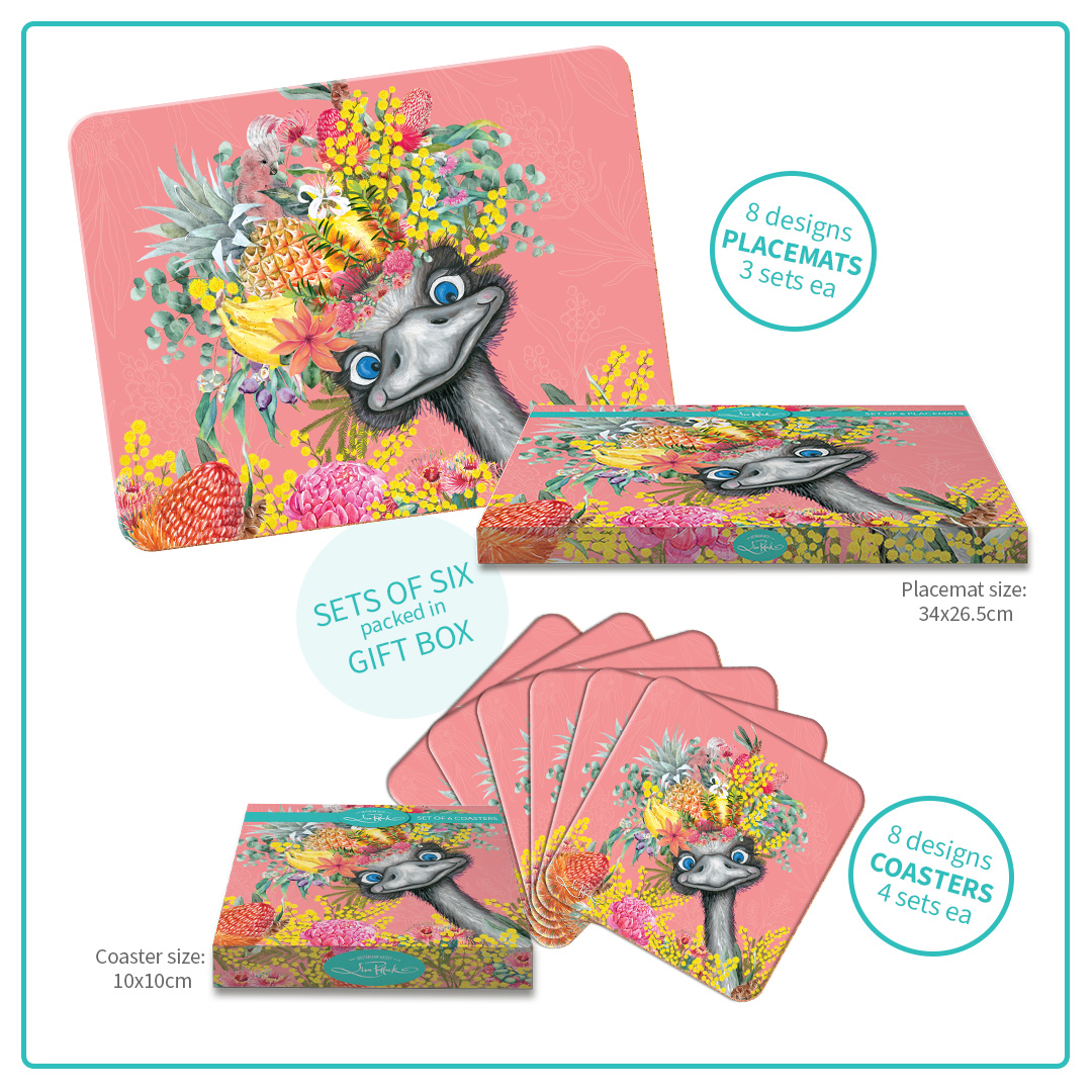Set of 6 Coasters in gift box. Emu-sing design. MDF & cork.10x10cm ea.