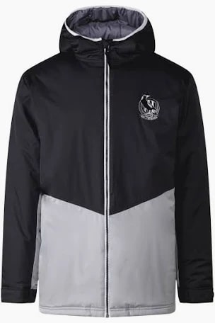 Official AFL Merchandise Collingwood Magpies Mens Stadium Jacket; Polyester honeycomb ribstop – Polyester lining – Polyester fill – Elastic sleeve cuff – Contrast zip – Sleeve panel – Forward shoulder panel – Front yoke panel – Drop tail – Front zip pockets – Hood opening contrast bind – Front logo embroidery – Back wordmark print