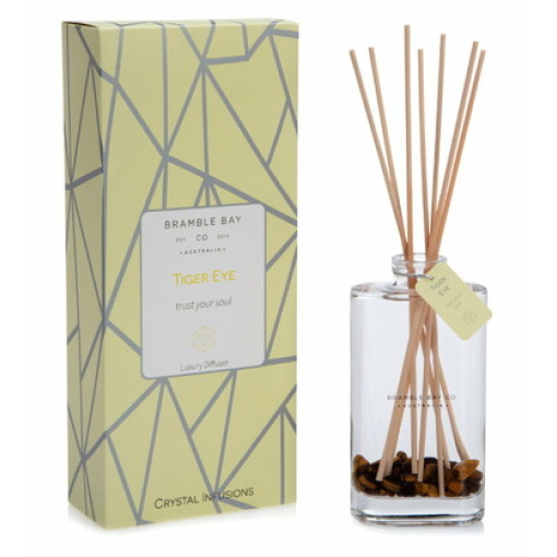 Tiger Eye promotes harmony and is perfectly paired with sweet vanilla bean and luscious custard. Enjoy our Australian Made 150ml Reed Diffuser infused with semi-precious Tiger Eye Chips.