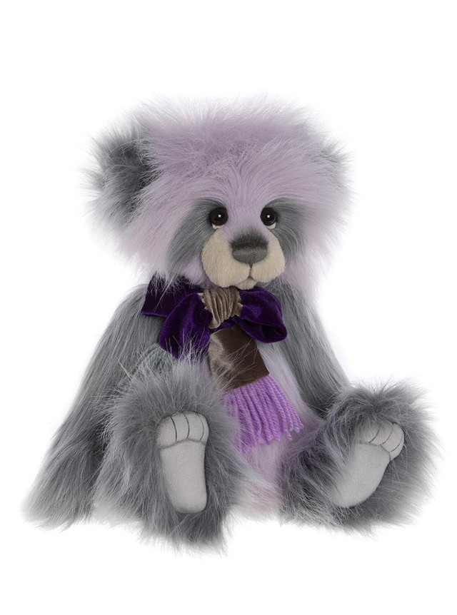 She is created with long plush fur in grey and lilac shades, complimented bear-utifully with a purple scarf.