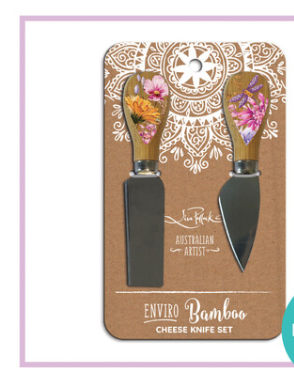 Set of 2 Cheese Knives, bamboo handles, on backing card. Dragonfly Fields
