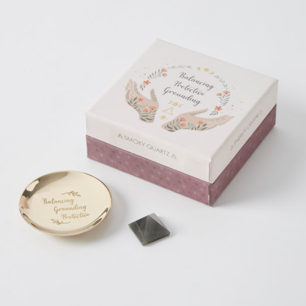 The Smokey Quartz is said to promote Balance, Groundedness, and Protection. Crafted into a pyramid shape, this crystal is designed to transmit your intentions to the universe. Comes with a laser-etched brass plate to carry this semi-precious stone. Artfully hand-cut, each stone exudes one-of-a-kind beauty. The perfect gift set for those in touch with their spiritual side.