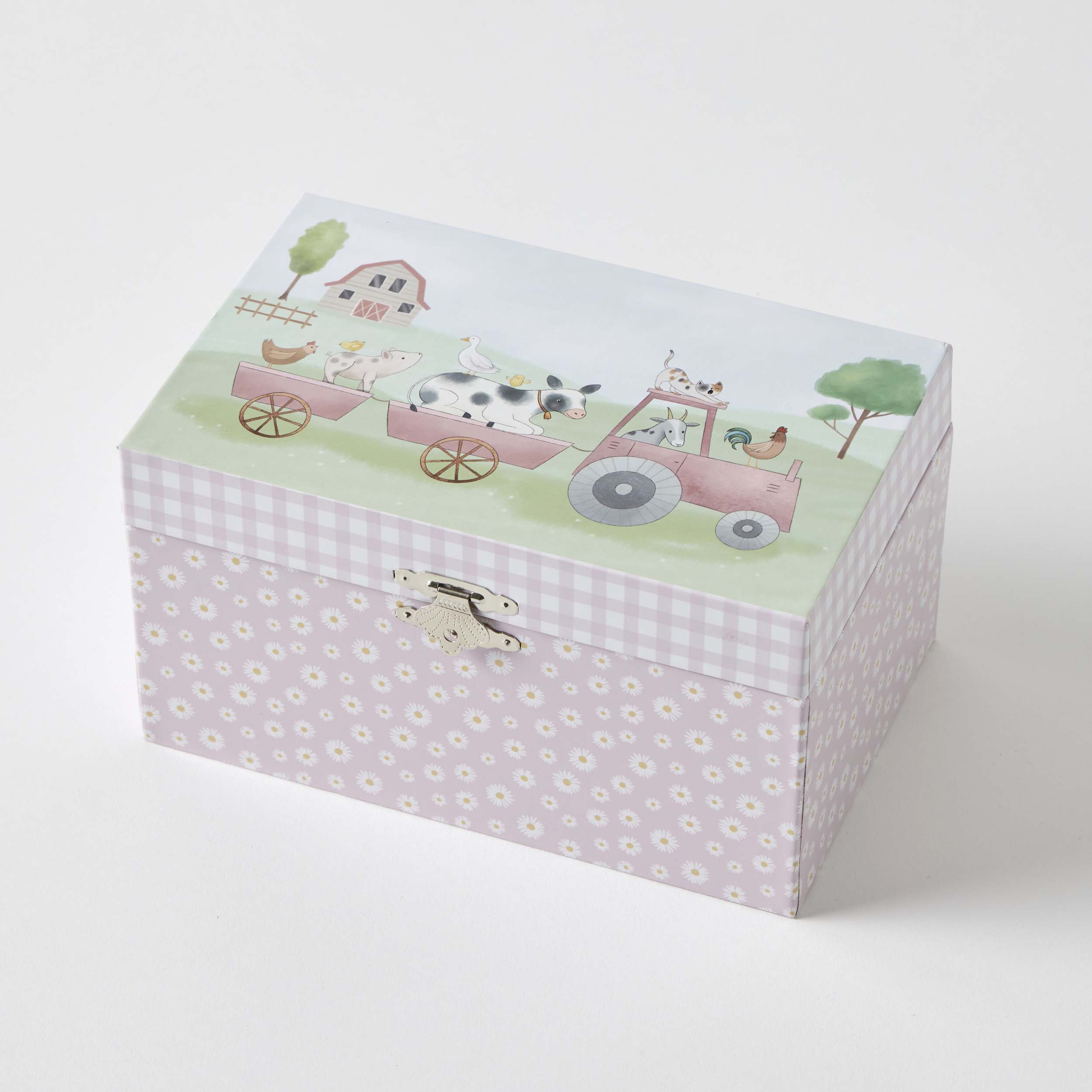 Little ones will love the Farm Fun Jewellery Box! Adorable yet practical, this piece can store trinkets, treasures, and more. This jewellery box features a gorgeous design of farm animals on its exterior and includes an animal figurine and mirror inside.