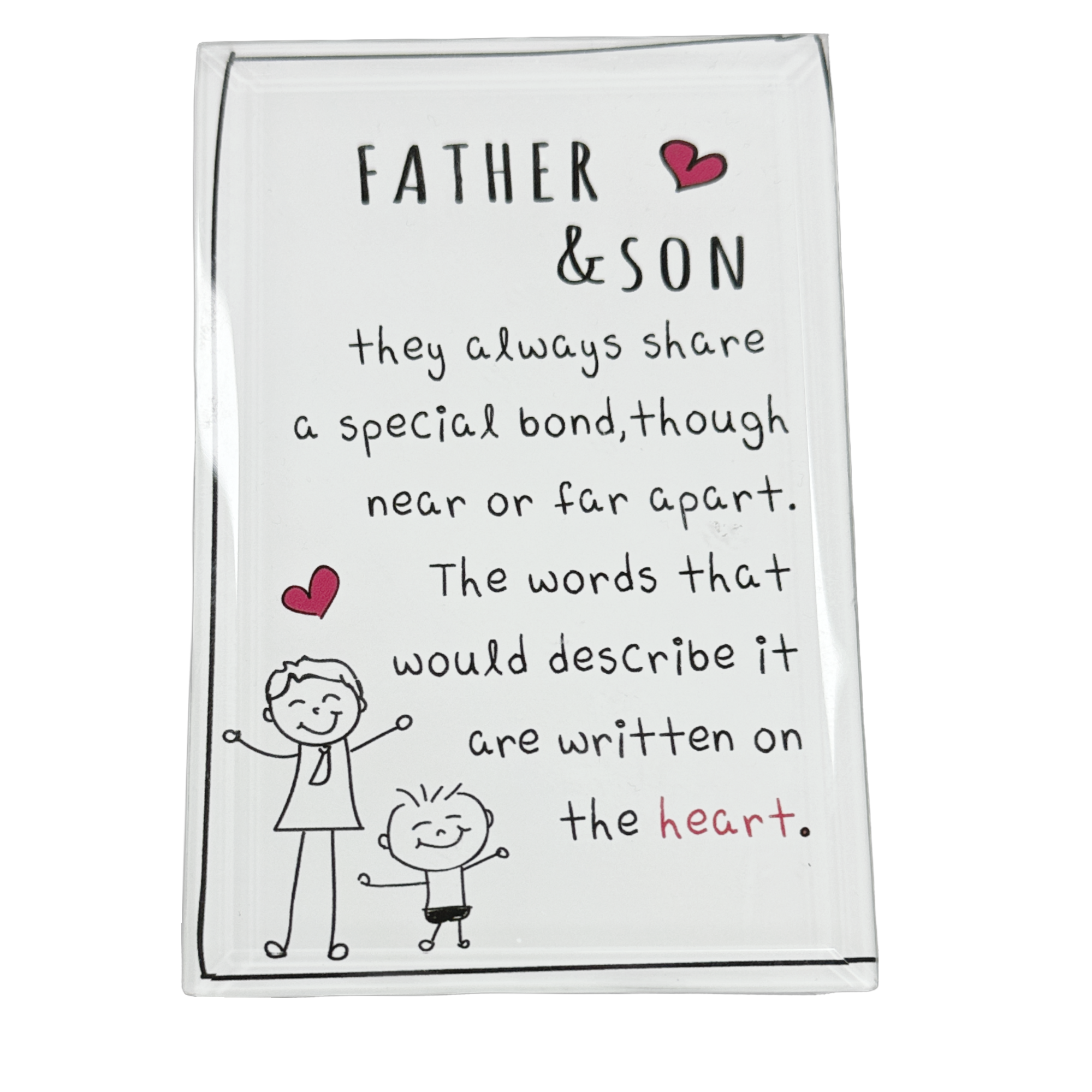 Celebrate the special bond between a father and son with our exquisite 12cm x 8cm glass sentiment plaque. This beautifully crafted piece is a perfect way to express love and appreciation. Add a touch of elegance to any space with this heartfelt tribute to the unique relationship shared between a father and his son. Shop now and cherish this timeless keepsake.
