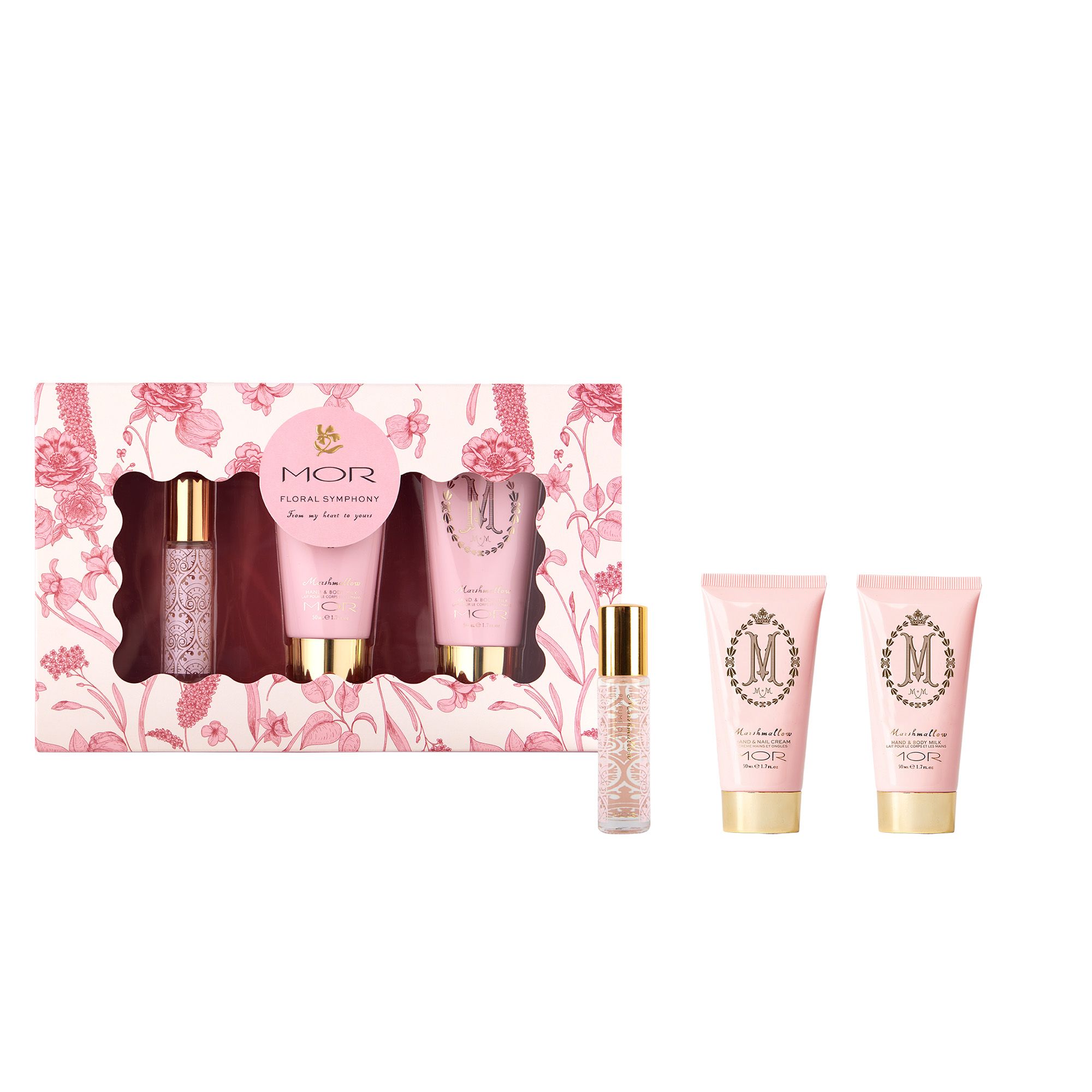 The set includes a Marshmallow Hand Cream, Body Milk, and Perfume Oil, leaving skin with a satin-like and delicately scented finish.