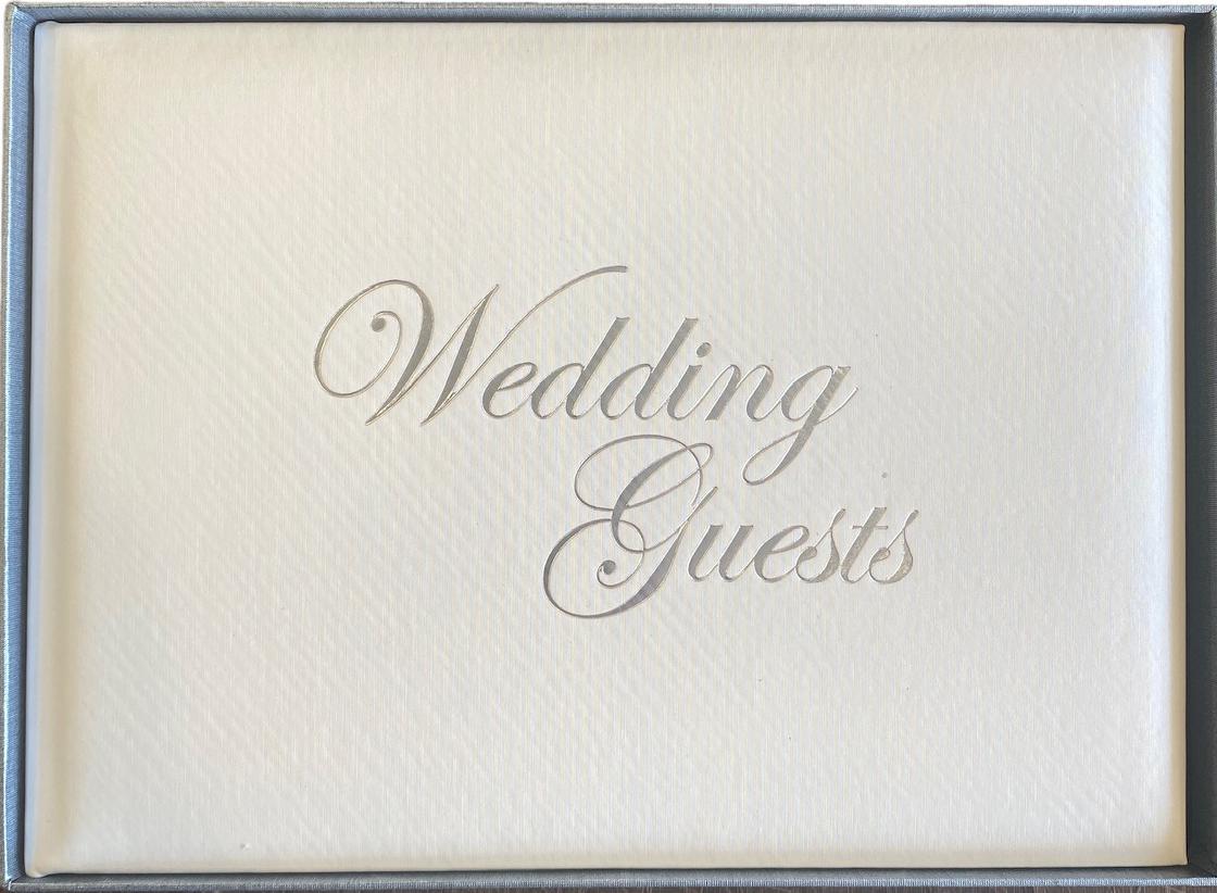 This wedding guest book features an elegant white design with lined pages, offering a personalized touch for guests to leave heartfelt messages. A timeless keepsake to cherish special memories from your big day.