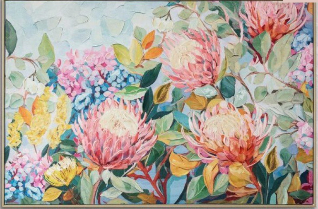 This Hand Painted Protea Canvas Print in Frame features a detailed protea design, meticulously crafted to enhance any space. Measuring 122.5cm x 82.5cm x 4.5cm, it combines artistic elegance with a durable frame for a refined finish.