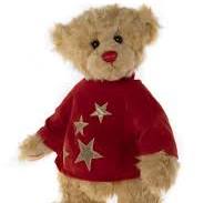 Description: Jingle Belle is a sweet standing light gold bear wearing a removeable red velour jumper adorned with gold embroidered stars.