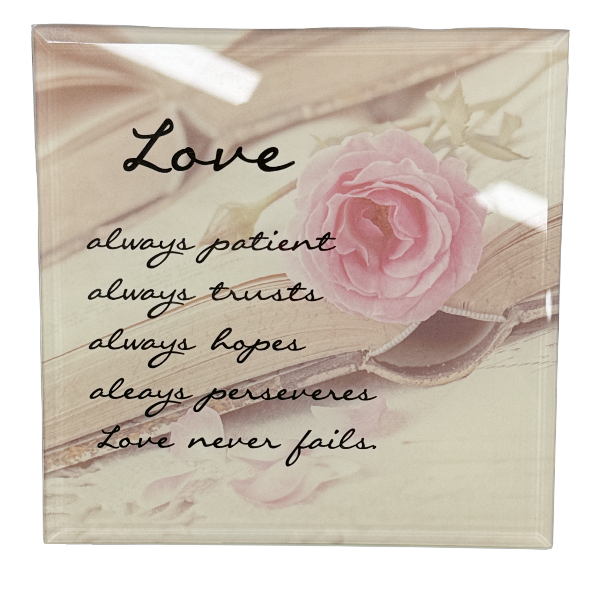 Introducing Love Verse, a beautifully crafted 15cm x 15cm piece that encapsulates the essence of love – always positive, trusting, hopeful, and enduring. Let this exquisite creation remind you that love never fails. Add it to your collection today.