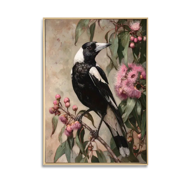 Enhance your space with the Magpie with Pink Gum Nuts Canvas Brushed Print, featuring a unique design inspired by nature. Handcrafted with attention to detail, this artwork combines natural materials with a light natural frame for a timeless finish. Measuring 50 x 70cm, it’s a perfect addition to any room, blending contemporary style with an organic touch.
