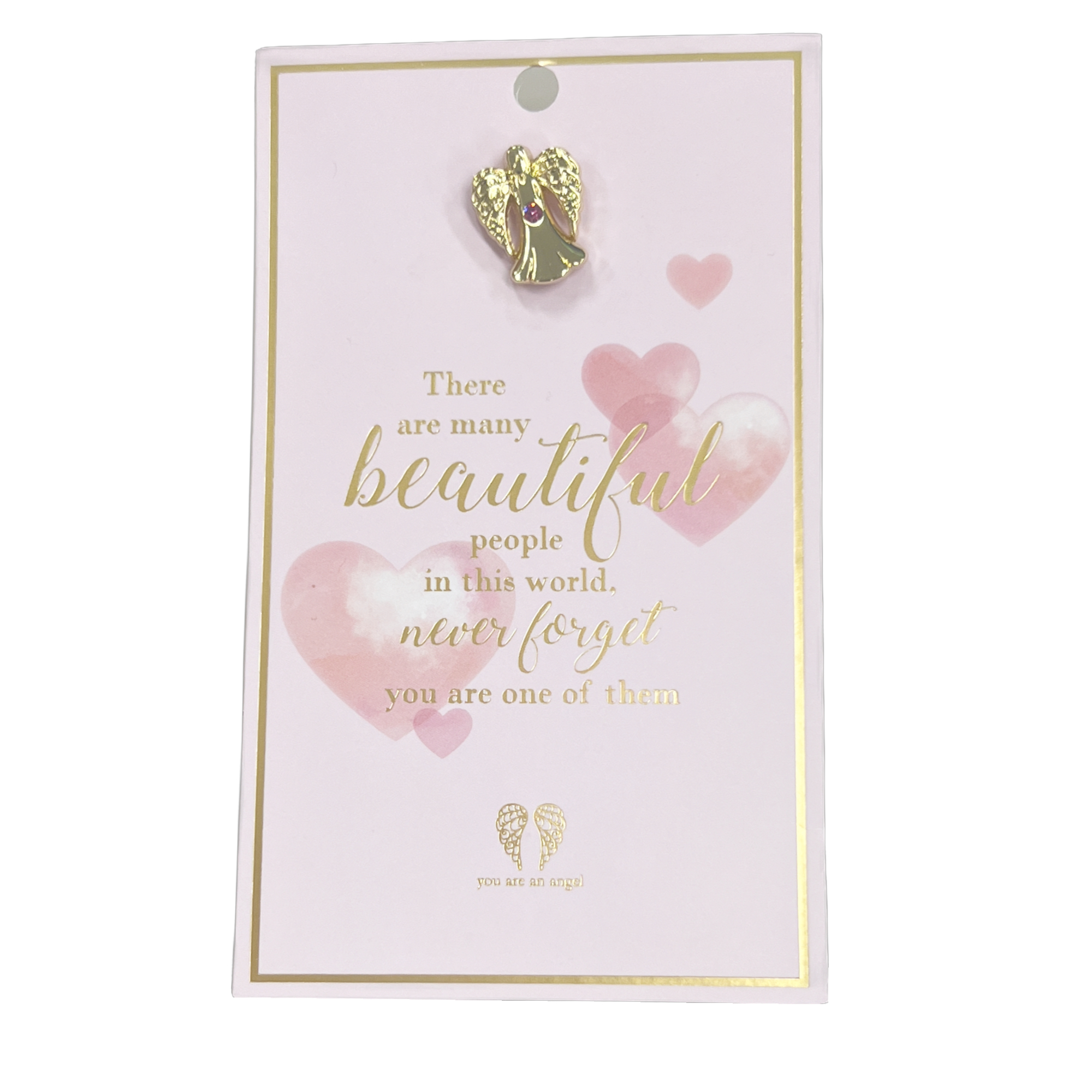 You Are An Angel pins are a thoughtful way to show how much you care. This pin is shaped in gold angel with a beautiful pink jewel embellishment with the sentiment, There are many Beautiful people in this world,