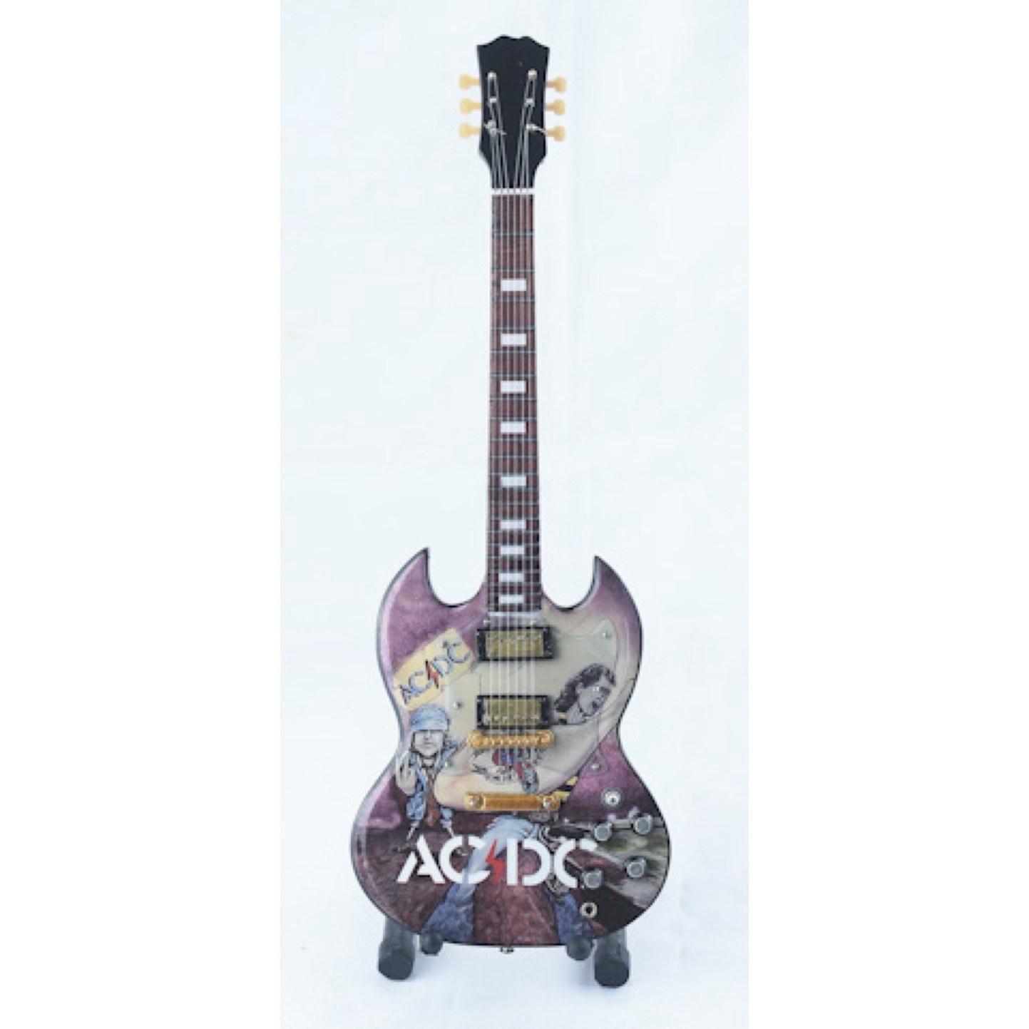 Miniature guitar, ACDC come complete with individual carton box (custom) + stand 25.4 cm tall Does NOT play