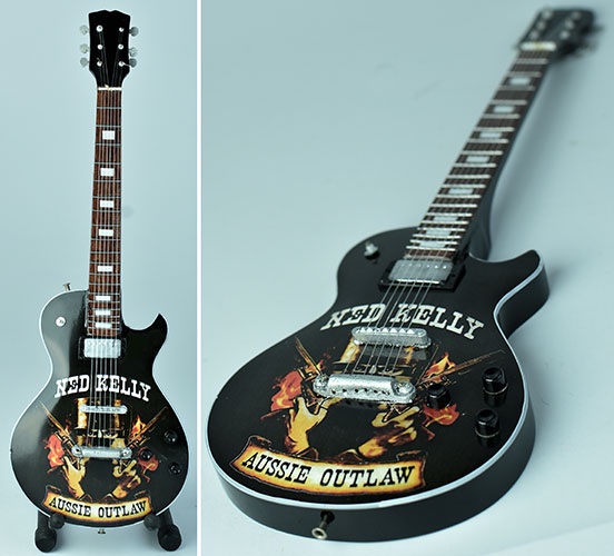 Miniature guitar Ned Kelly Aussie Outlaw, come complete with individual carton box (custom) + stand 25.4 cm tall Does NOT play