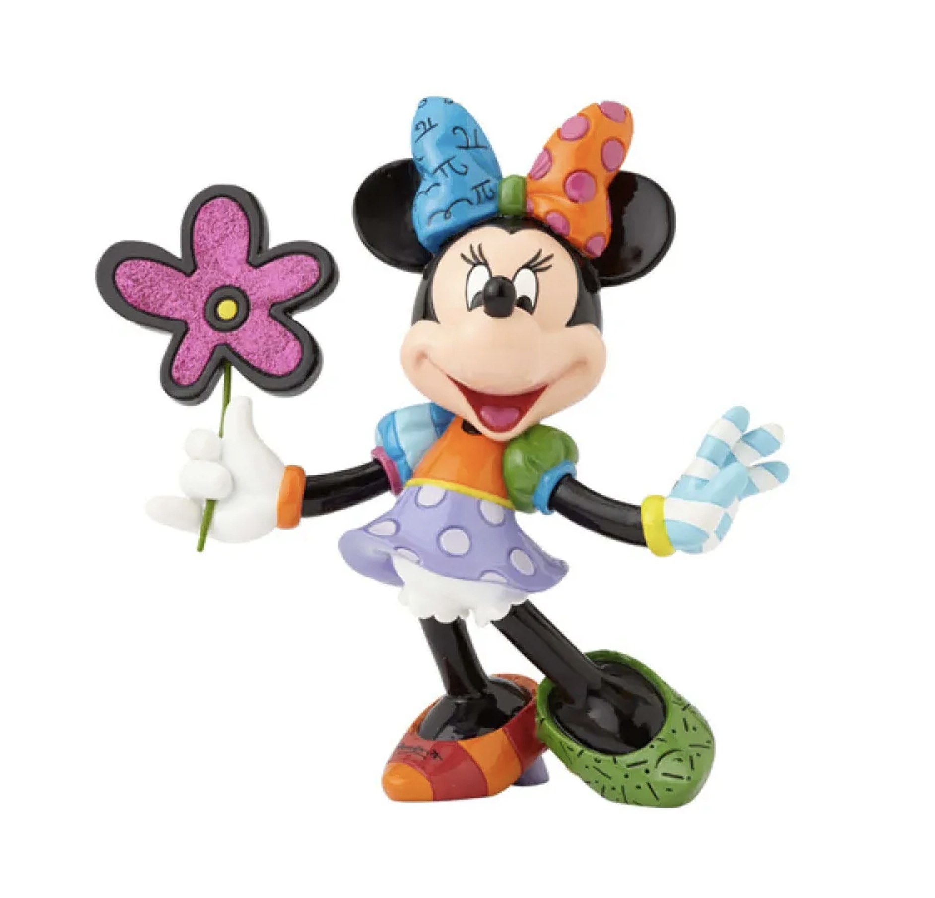 Designed by Pop artist Romero Britto, Minnie Mouse comes to life in vibrant color. Her “diamond dusted’ daisy will light up anyone’s dreary day.