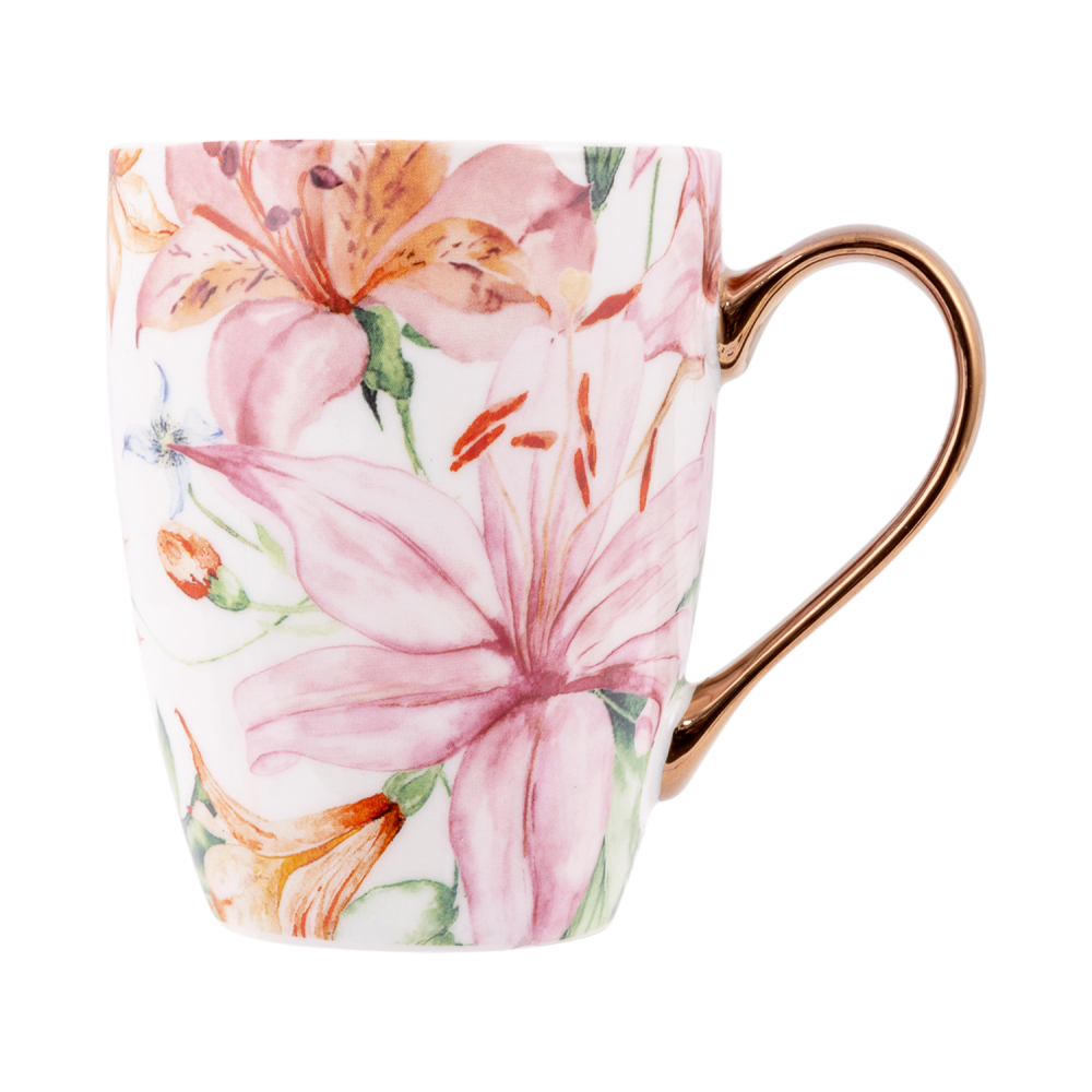Details: High shine glazed mug with floral pattern. Rose gold finish with quote on inside lip.