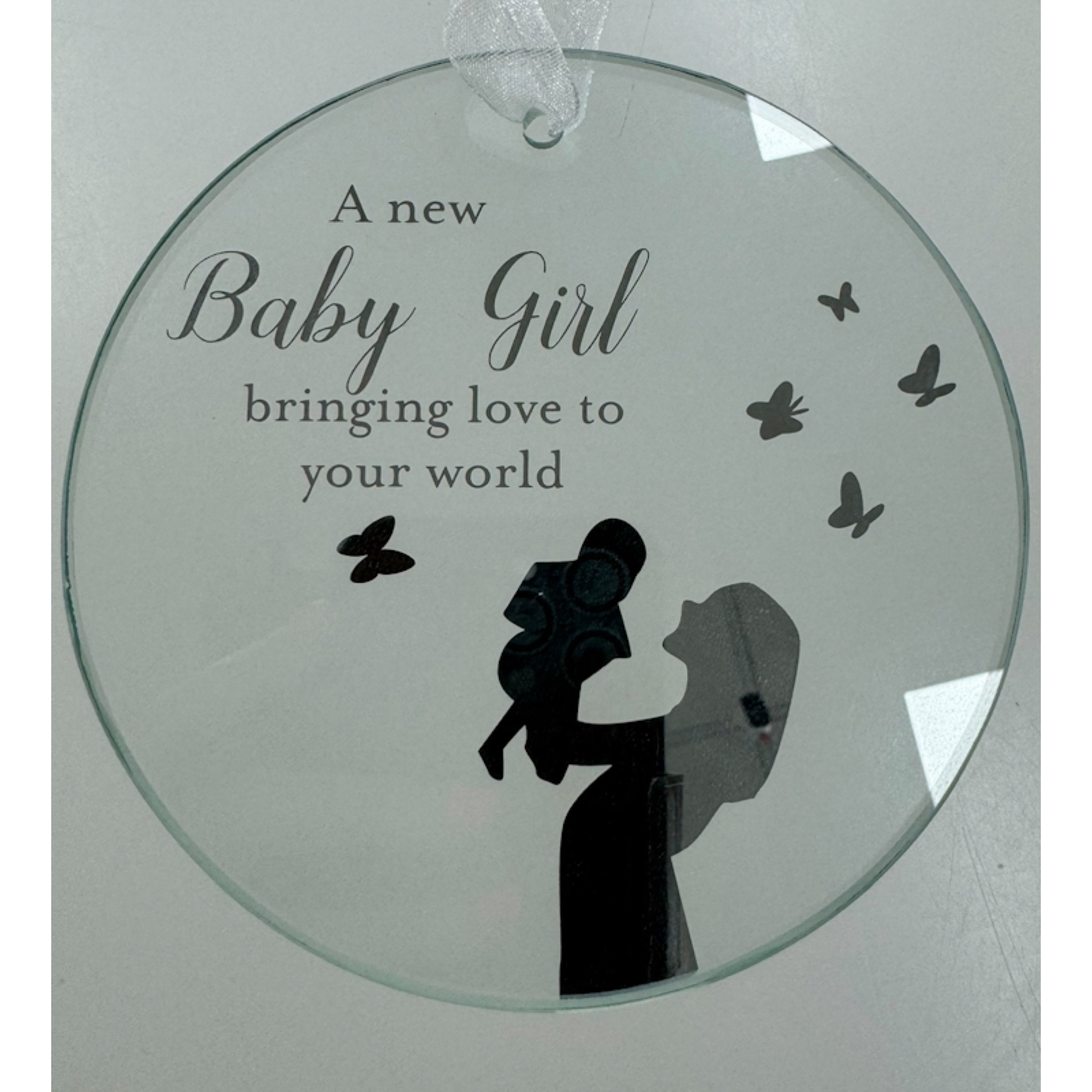 Celebrate the arrival of a new baby girl with this stunning 12cm round glass hanging ornament. Its intricate design and delicate beauty make it a perfect addition to any nursery or baby shower. Add a touch of elegance to your space with this beautiful keepsake.