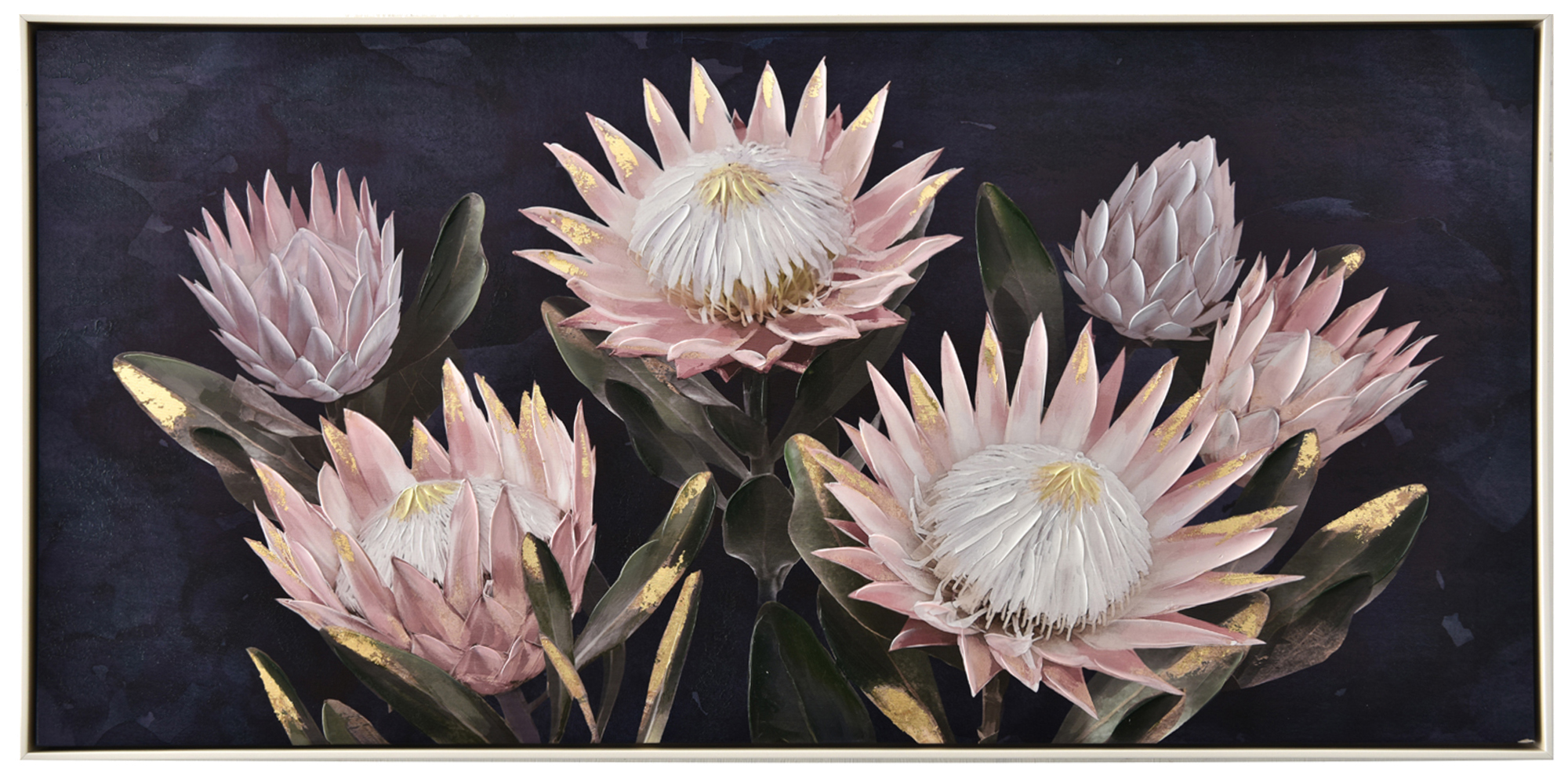 The Night Proteas Painting showcases vibrant colors and intricate brushwork, capturing the beauty of proteas in a striking nocturnal setting. Measuring 123 x 63 cm, its large size makes it a perfect centerpiece for any room. This artwork blends detailed craftsmanship with bold visual appeal, creating a timeless addition to your decor.