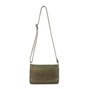 Soft woven front leather shoulder bag, with a single top zip compartment, rear zip pocket and adjustable shoulder strap. Measures 25cm W x 16cm H x 4.5cm D