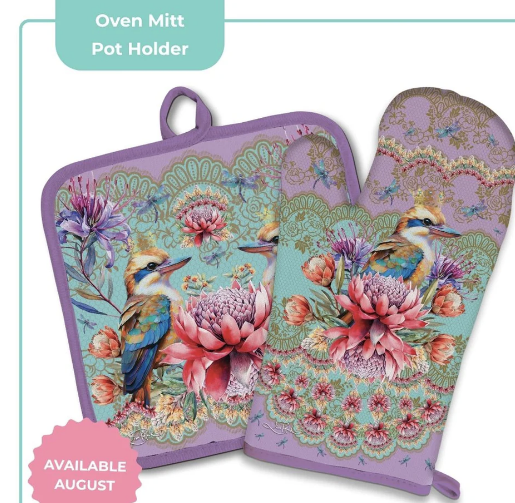 This oven mitt and pot holder set features a vintage kookaburra design, combining retro charm with functionality. Made from durable, heat-resistant materials, it ensures safe handling of hot cookware.
