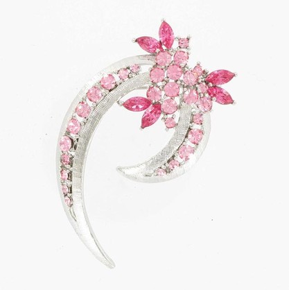 Elevate your style with the dazzling Pink Spray Brooch featuring exquisite rhodium floral details adorned with light rose and rose Swarovski crystals. Add a touch of elegance and glam to your look with this stunning accessory – a must-have for any fashion enthusiast!