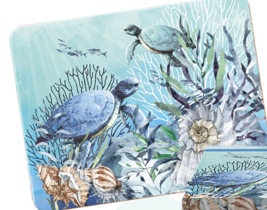 Set of 6 Placemats in gift box. Turtle design. MDF & Cork. 34×26.5cm ea.