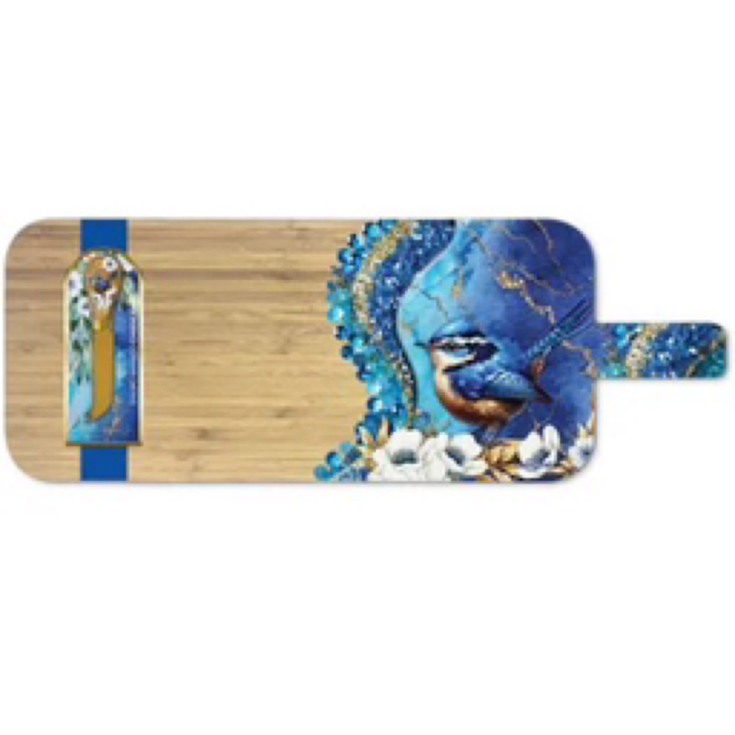All NEW. Bamboo Serving Platter with resin overlay and gold flakes. Includes matching cheese knife with gold blades and beautiful printed backing card with gold detail. Board size 55x20cm Cheeky Wren