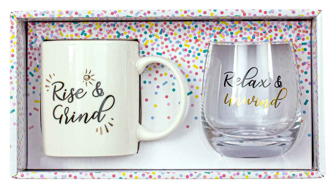 Rise And Grind Relax & Unwind Mug & Stemless Set