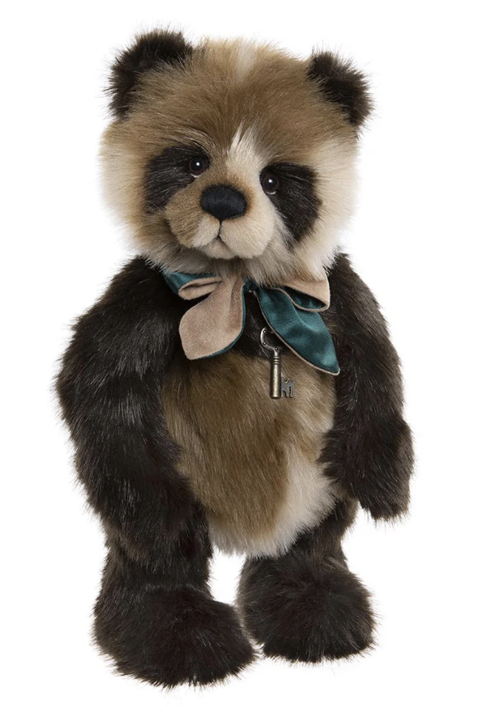 Roberto is fully standing and is crafted from the finest plush material in shades of dark brown, light brown, and beige. He’s dressed to impress with a charming teal and beige neckerchief and a special key necklace.