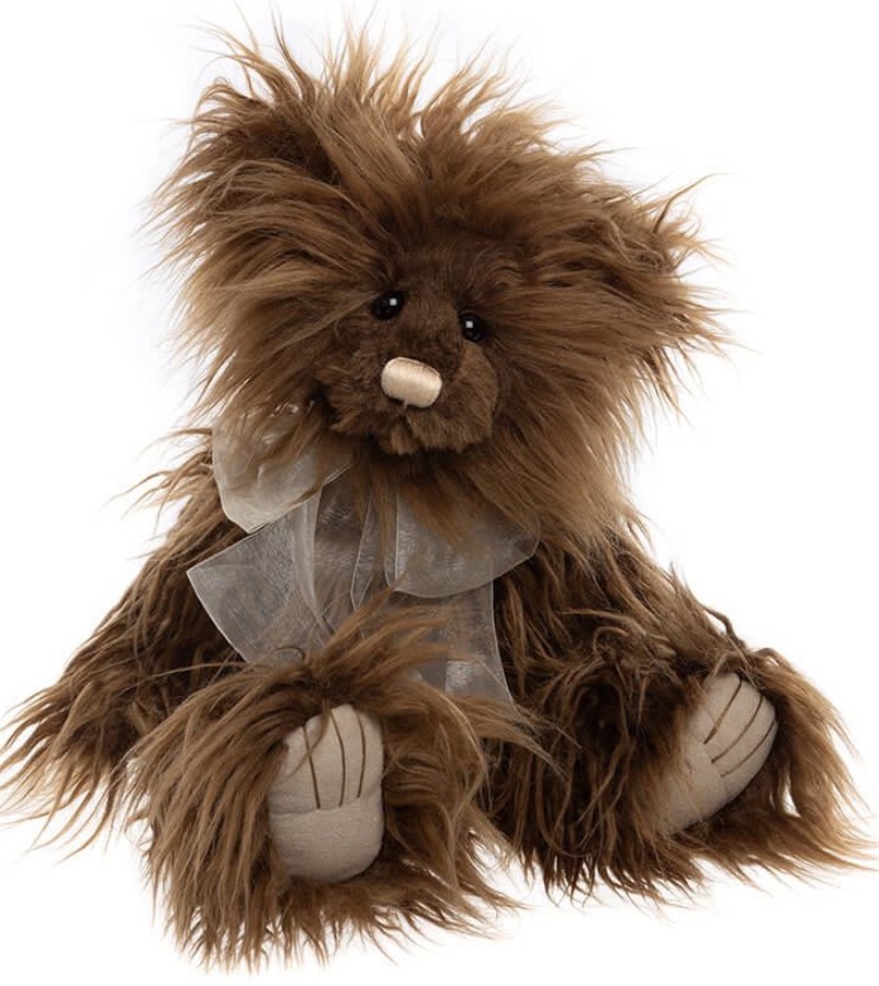 Meet the charming Rumbledethumps, whose fluffy, tousled fur invites endless cuddles. Crafted from luxuriously soft, long-pile rich brown plush, he radiates warmth and cosiness. With a hand-embroidered light nose, shaved muzzle, expressive dark eyes, and tickly toe detailing, every deatil brings him to life. A white organza bow around his neck completes his irresistible look. Recommended for ages 3 years +. Bear height: 38cm/15”/12.7 Bear Paws.