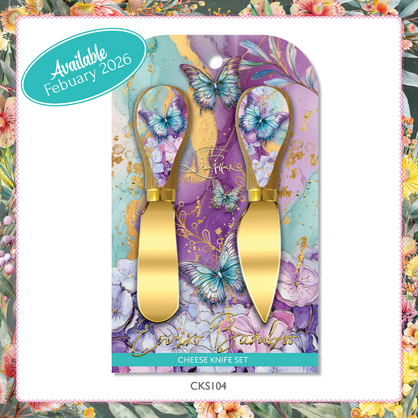Set of 2 Cheese Knives, bamboo handles, on printed backing card. Amethyst Butterflies