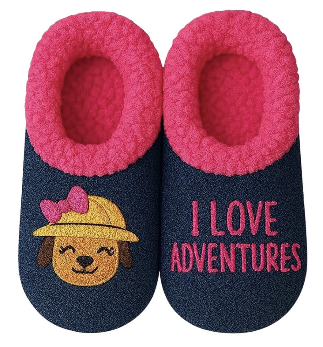 SLUMBIES SLIPPER SOCKS – Unique design on each kids slippers that are made with a brushed fleece exterior in a fun colourful paw print pattern and then lined with a soft Sherpa fleece inside. Makes excellent novelty slippers for gifts!