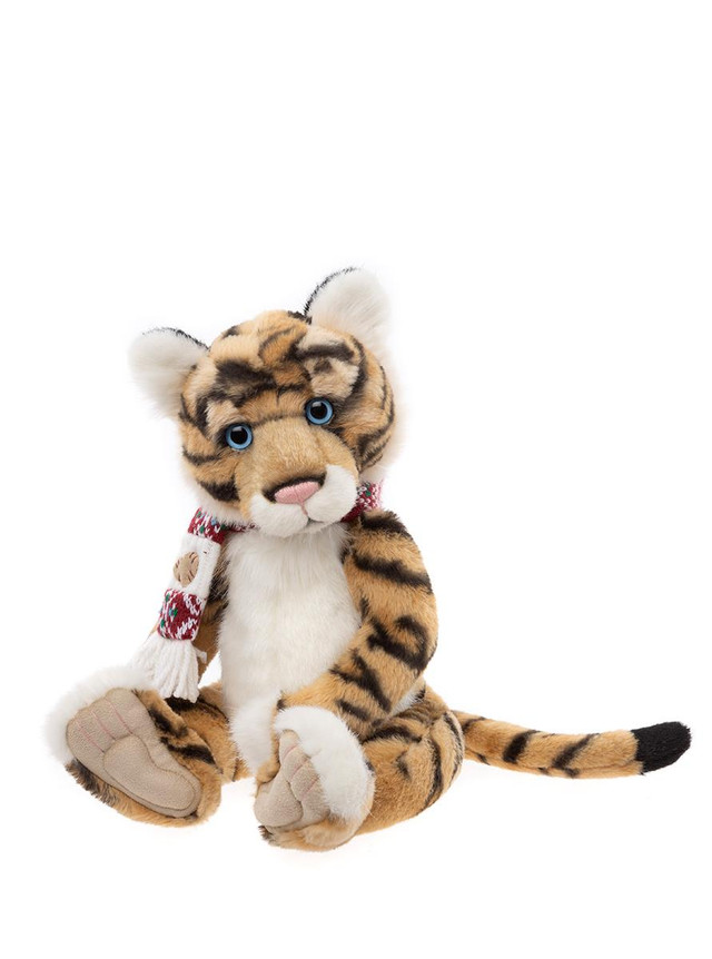 Taradiddle is part of our extra-special Paw Store Exclusive Collection, meaning you’ll only find her at our Charlie Bears Paw Stores. This enchanting tiger is crafted from sumptuously soft plush fur in rich golden tones, adorned with bold black stripes, a snowy white tummy, and other delightfully fluffy white accents. With beautifully sculpted paws featuring tickly toe detailing, soulful blue eyes, and an endearing face, Taradiddle is bursting with personality and simply longing for cuddles. She comes dressed for comfort and charm in a cosy red and white knitted scarf – perfect for snuggly days. Recommended for ages 3 years+. Tiger height: 38cm/15″/12.7 Bear Paws.