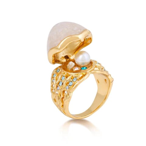 inspired by Ariel’s under the sea adventures comes this statement ring boasting ornate detailing and shimmering crystals. The mother-of-pearl style finish creates a shell design that opens to reveal even more beauty inside.