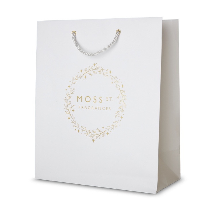 For easy, fuss-free holiday gifting, simply place your Moss St. Fragrances products in this sleek white gift bag with a gold foiled wreath. No wrapping needed!