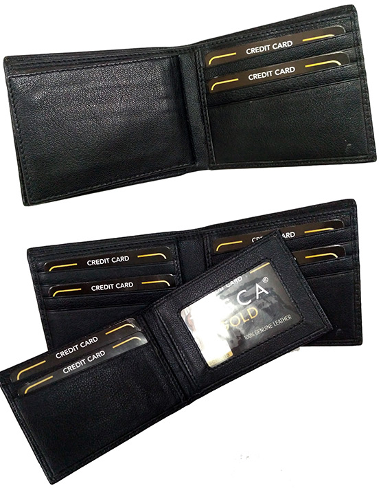 Men’s RFID blocking leather wallet (full grain cow hide), with 11 x internal card holder compartments and removable wallet card.