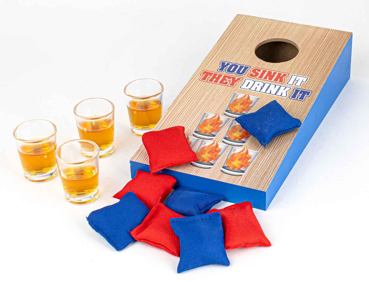 – Includes 1 game board, 8 cornhole bags and 4 shot glasses.