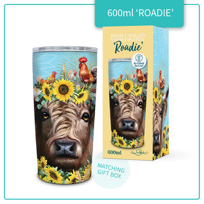 Double walled Stainless steel travel mug with spill proof lid. 600ml capacity. Sunny Highland.