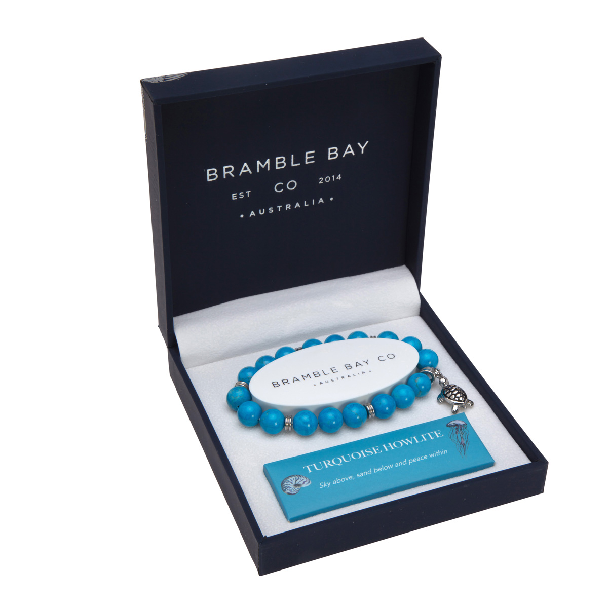 Carry a little bit of the Ocean with you every day with our Stainless Steel Turtle Charm Bracelet Collection. Beautifully gift boxed in a navy blue soft touch box with embossed palm trees on the lid. Each 10mm bracelet comes with its very own Ocean Inspired Inspiration Card and has a little stainless steel dangling sea turtle charm.