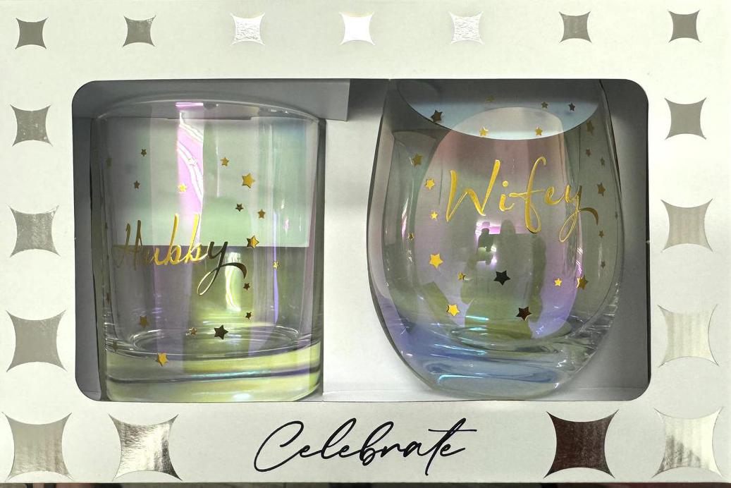 Elegant glass set featuring a ‘Hubby’ scotch glass and ‘Wifey’ stemless wine glass, crafted from high-quality materials. Ideal for weddings or special celebrations.