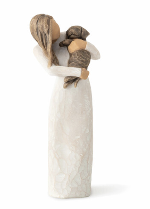 A puppy brings joy, exuberance and a bit of chaos into the household at first, then mellows over time to become a companion, a playmate, a confidante; always happy to see us, never tiring of our presence. As a metaphor for friendship, a dog represents the trust and comfort of a good friend, and how this relationship grows in value through the years. This sculpted figure is a gift for dog lovers, friends, veterinarians, pet-sitters… an expression of friendship, love and appreciation. This figure is also available holding a DARK dog #28040.