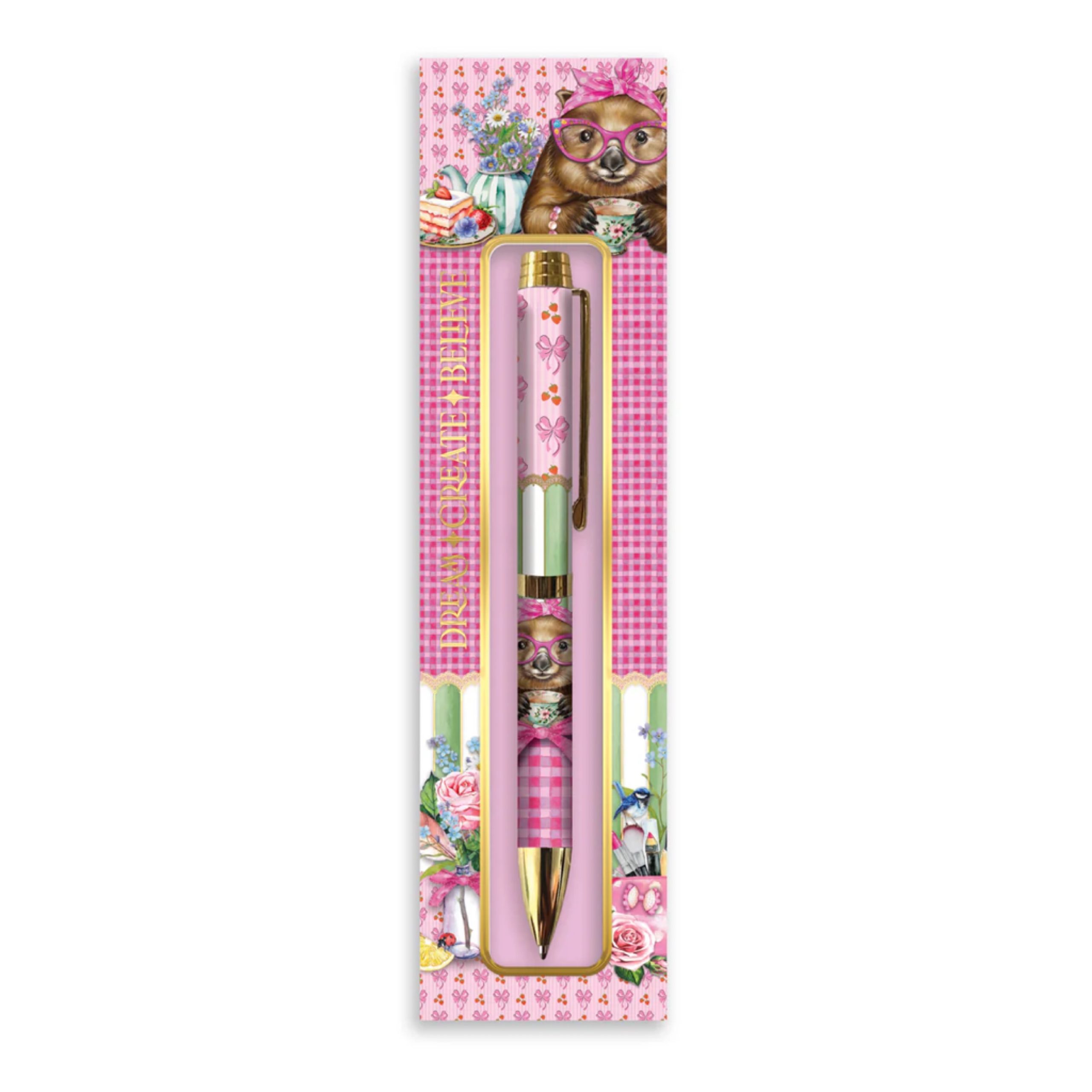 We’re bringing our original Lisa Pollock designs to your everyday! With these beautiful black ink pens! Sold in matching golden detailed gift boxes. This pen has our NEW ‘Wonda Wombat’ design.