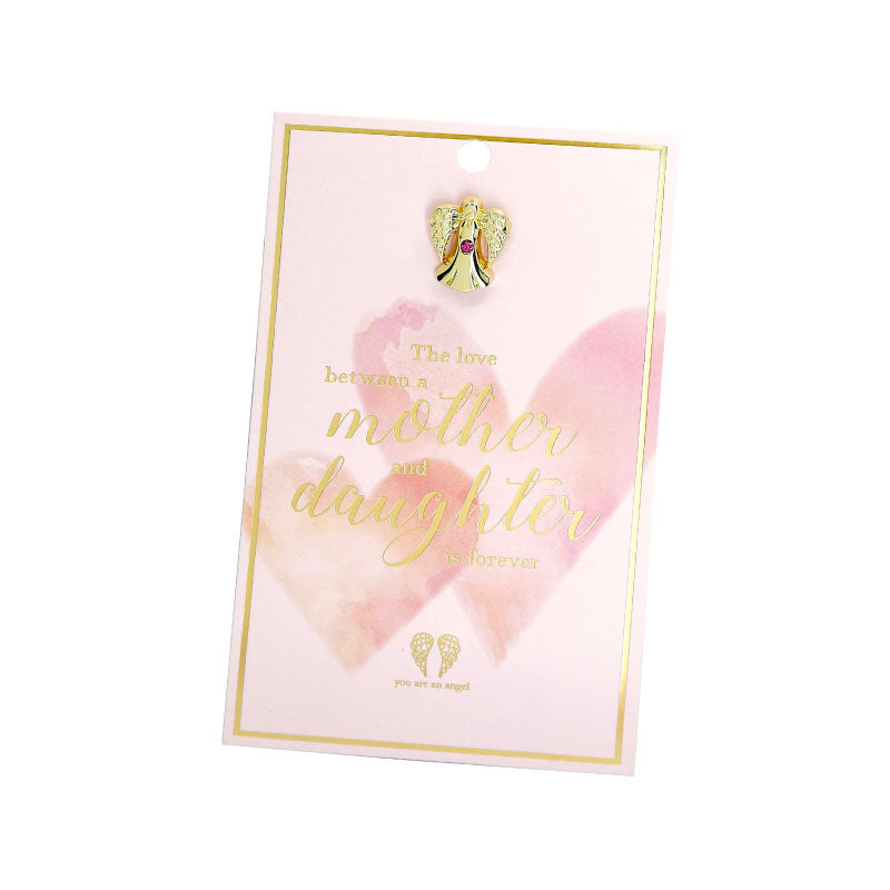You Are An Angel pins are a thoughtful way to show your mum or daughter how much you care. This pin is a gold angel with a beautiful pink jewel embellishment with the sentiment, “The love between a mother and daughter is forever” on the paper card. A sweet and thoughtful gift idea for loved ones.